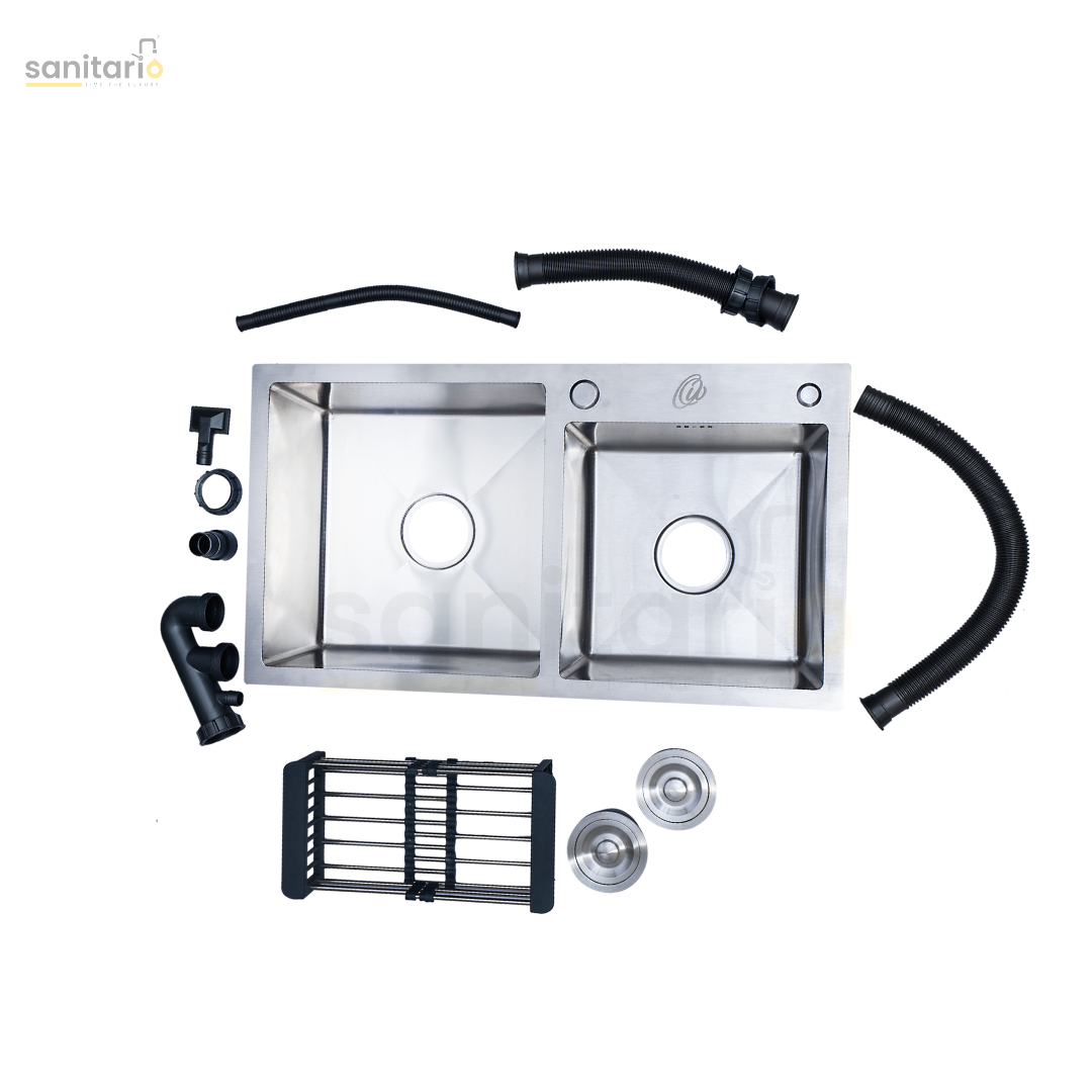 Upgrade your kitchen with the Sanitario® Handmade Double Bowl Stainless Steel Sink, crafted from premium heavy-gauge stainless steel for long-lasting durability and a modern, elegant finish. Designed for both functionality and style, this sink brings professional-grade performance to every home.