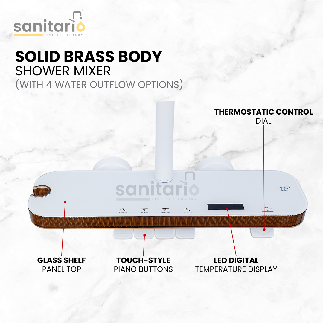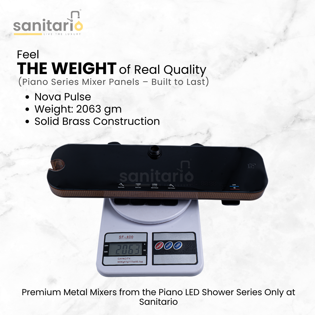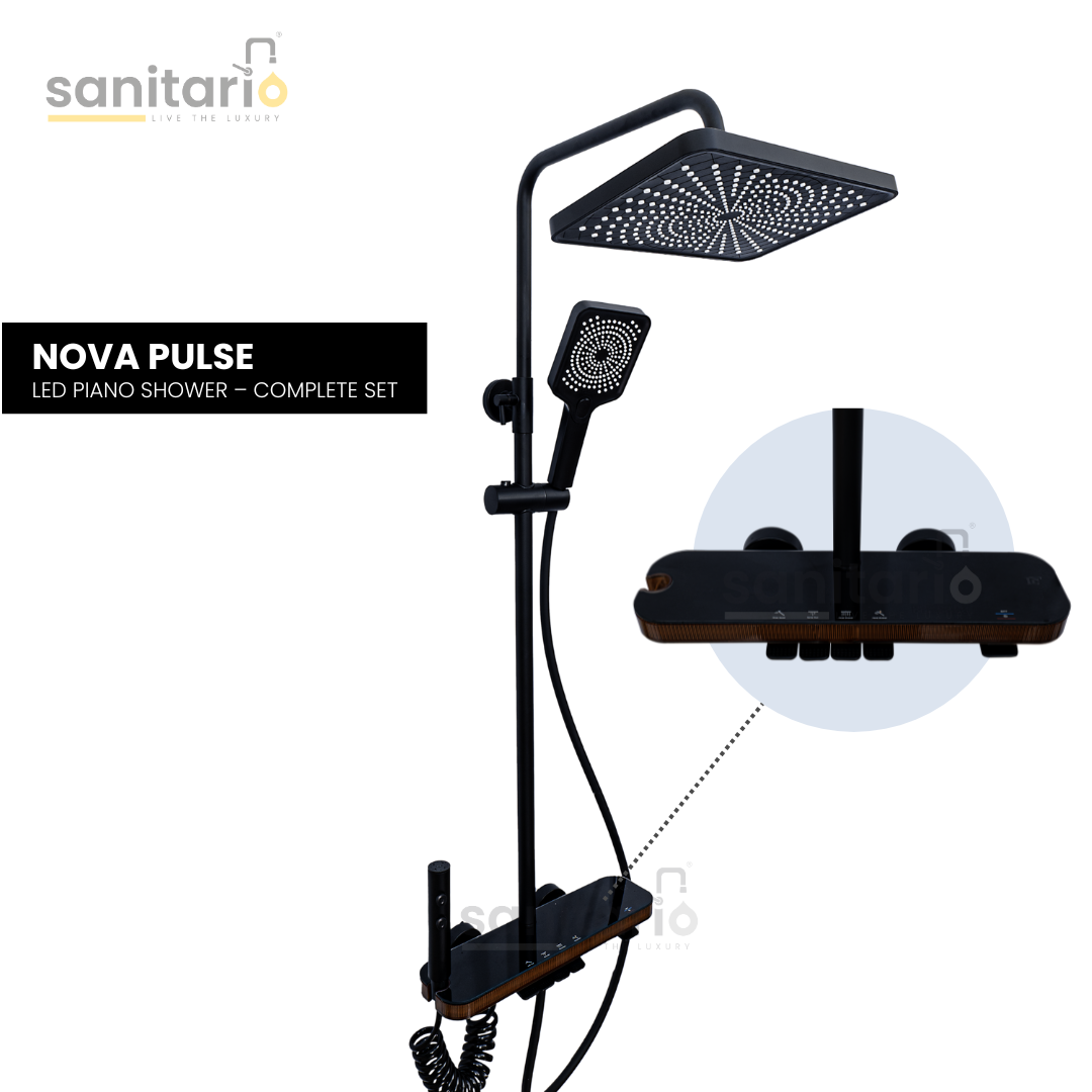 Bold, refined, and engineered for daily performance the Nova Pulse is Sanitario’s sleekest LED Piano Shower system crafted to elevate your bathroom experience. With a deep black body accented by rich wood-textured details, this complete set combines beauty, durability, and intuitive water control for the modern home.