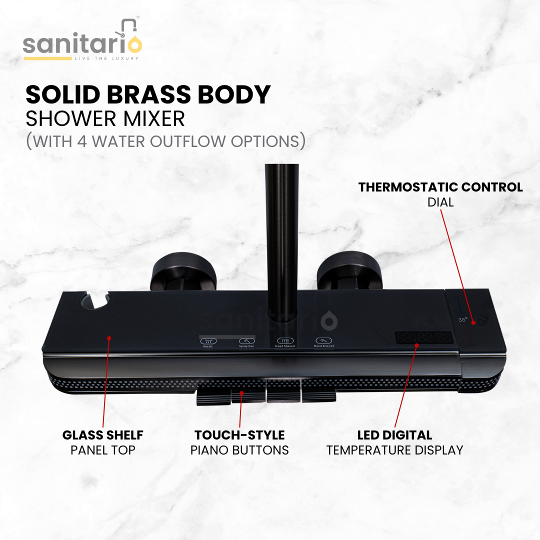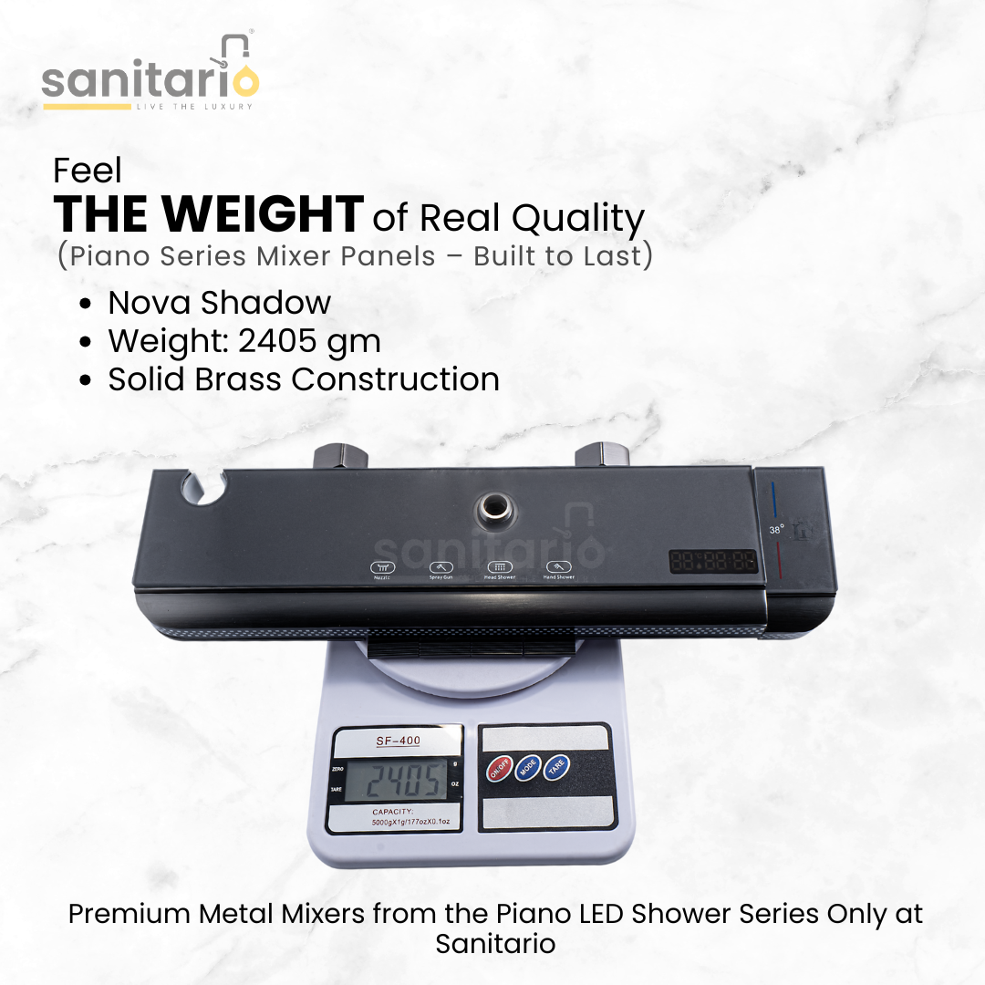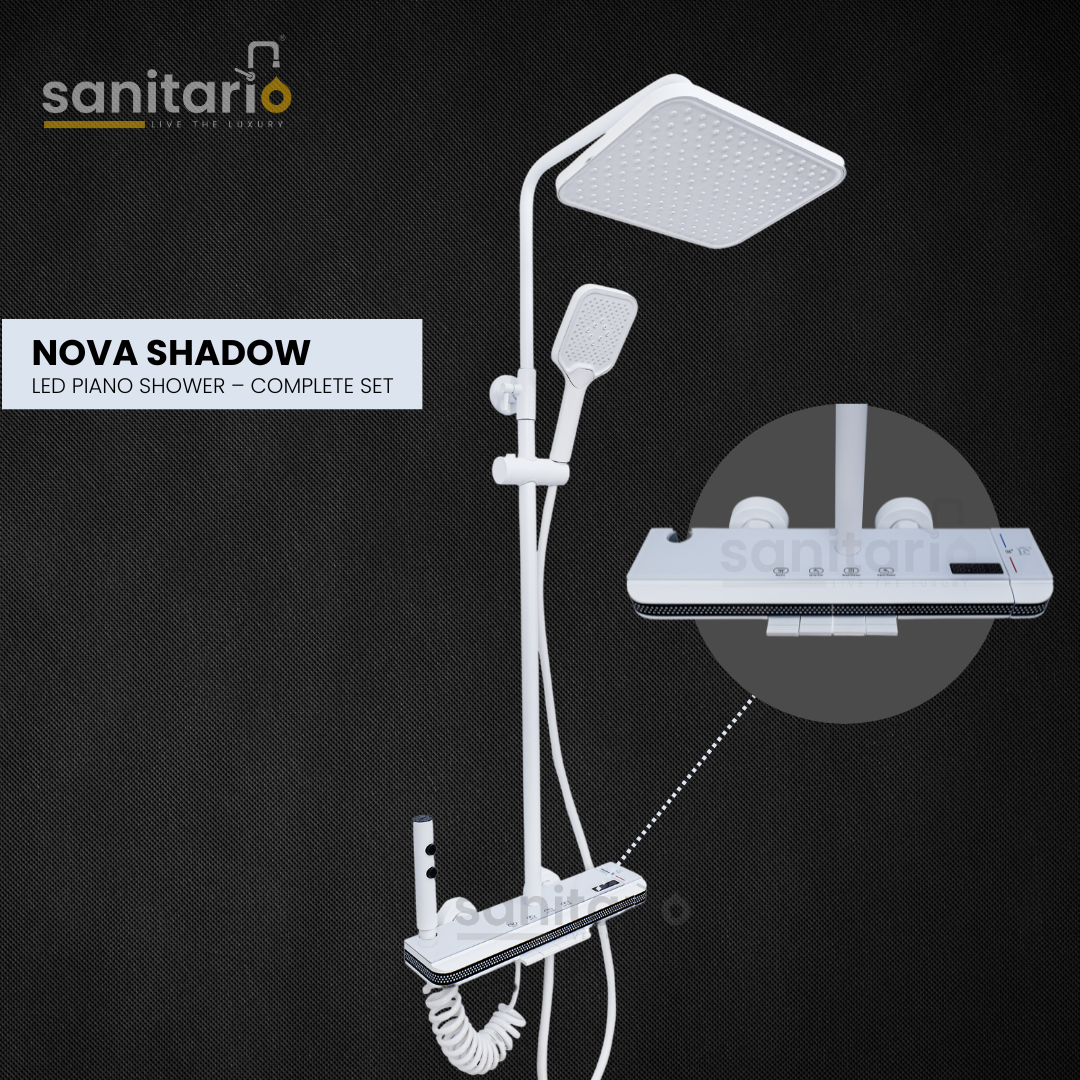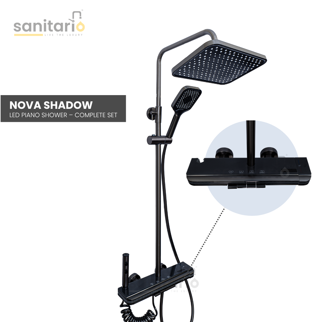 Sleek, minimal, and designed for modern living — the Nova Shadow is Sanitario’s piano-style LED shower system built for those who value clean aesthetics and reliable daily performance. With intelligent water control and a refined finish, this complete set delivers both functionality and elegance in every drop.