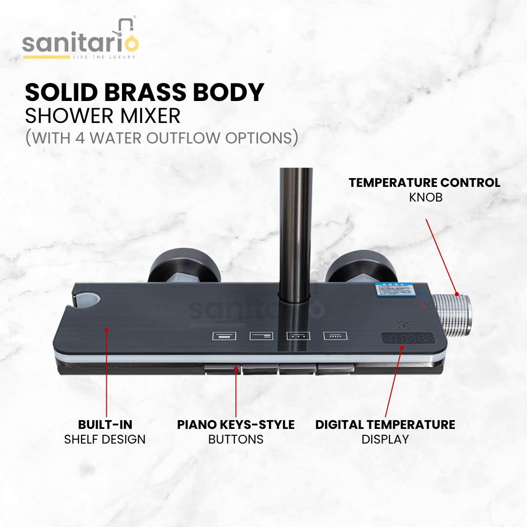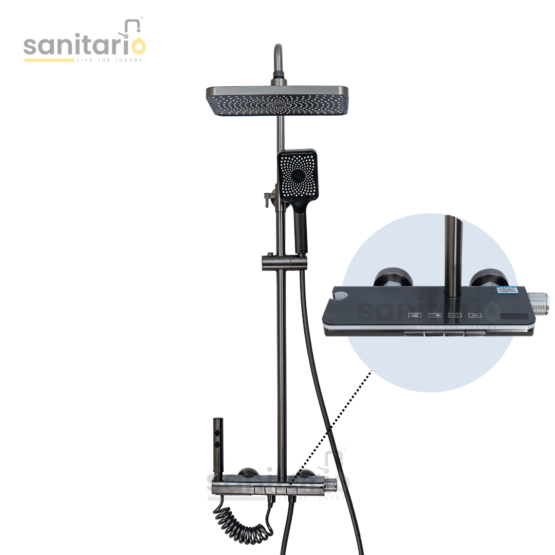 Bring bold innovation to your bathroom with the Titan Flow, Sanitario’s powerful and versatile piano-style shower system. Designed for high performance and contemporary style, this complete set features a digital LED display, premium push-button controls, and three functional water outlets — making every shower feel personalized and luxurious.